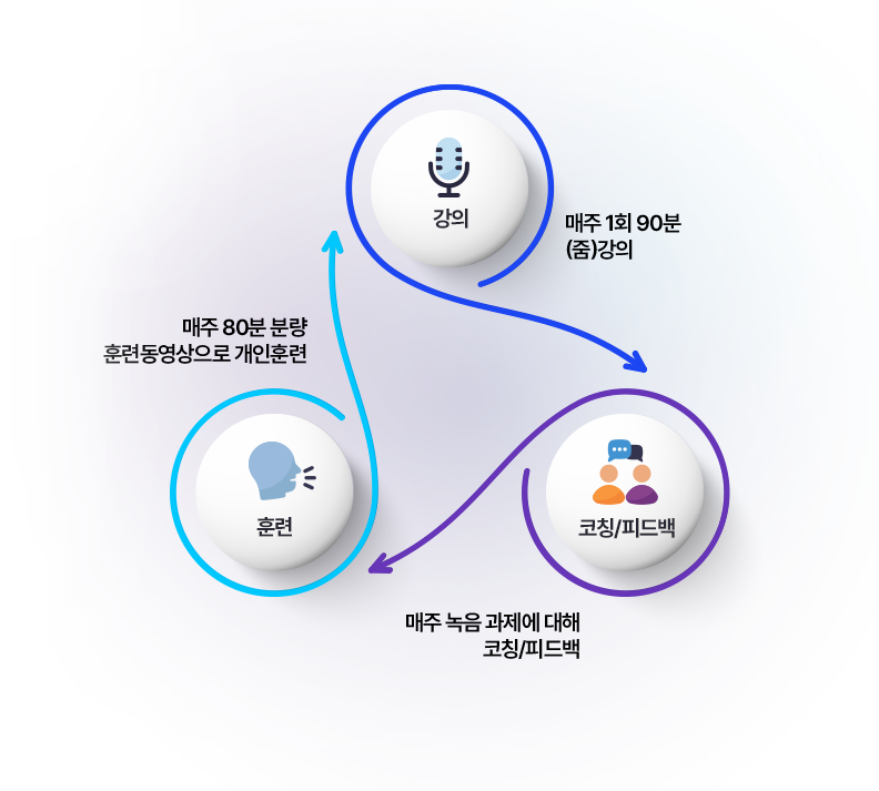 최고의 학습 결과를 얻기 위해 (줌)화상강의, 개인 동영상 훈련, 대표강사의 세심한 코칭/피드백을 최적의 비율로 융합한 시스템입니다.
